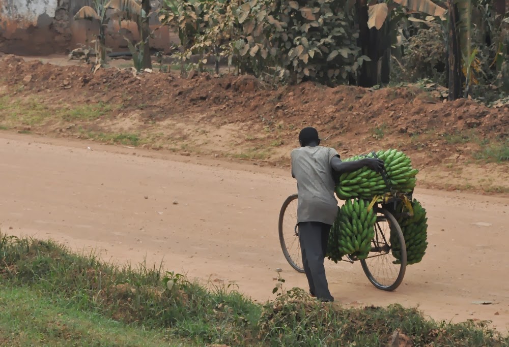 Ci fermiamo in un negozio bar dove i bambini fanno incetta di aranciata. Lì fuori una tettoia con un biliardo coperto, qui è piuttosto diffuso. In strada c’è poco traffico, sono soprattutto, Boda Boda (mototaxi). Passa un tipo alla cui bici è appeso un gran campionario di camicie, si ferma un attimo a tergersi il sudore dalla fronte, stessa cosa fa un altro uomo poco dopo, lui spinge una bici carica di matoke. In Uganda non ci sono carretti, la bici è il loro carro.