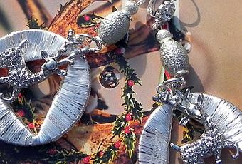 Grandi orecchini argentati con perla in vetro ovale grigia sabbiata, pendente con filo metallico e renna; gancio a monachella con cristalli.