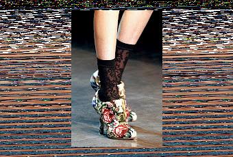 Dolce & Gabbana torna alla tradizione della tanto amata Sicilia! Così scendono in passerella meravigliose dècolletès con ghette e punta dorata alternate a modelli con inserti barocchi e stampe floreali. Ankle boote stivaletti con tacco stiletto sono pensati sia in tessuto che in vernice, con bottoni o stringhe a renderli più particolari, tronchetti portati con calza sottile e stivali alti stringati che nel gambale si velano di pizzo o mezzo punto, neri. Stupiscono sandali altissimi con plateau, effetto porcellana azzurra e pink, decorati da rose. Con un'unica concessione al rosso passione