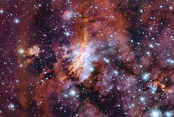 Immersi nei recessi di questa enorme incubatrice stellare si trovano tre ammassi di giovani stelle calde – stelle di appena qualche milione di anni – che risplendono di luce ultravioletta. È proprio la luce di queste stelle che fa brillare le nubi di gas della nebulosa. La radiazione strappa gli elettroni agli atomi – un processo noto come ionizzazione – che quando si ricombinano rilasciano energia sotto forma di luce. Ogni elemento chimico emette luce a un colore caratteristico e le grandi nubi di idrogeno della nebulosa sono la causa del loro intenso colore rosso cupo.