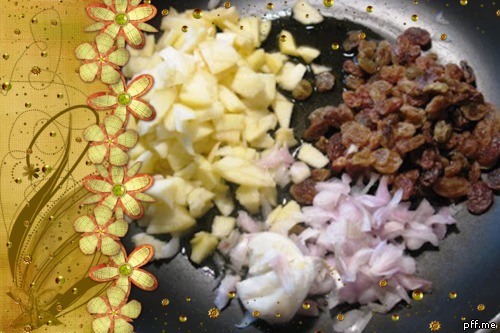 Nel frattempo in una padella porre 3 cucchiai di olio extravergine, uno spicchio d'aglio schiacciato , la cipolla tritata finemente, la mela tagliata a dadolini e l'uva sultanina ,messa precedentemente in ammollo ....