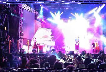 Alle ventidue è iniziato il concerto vero e proprio. E il racconto ero riuscito a terminarlo! La mia modesta conoscenza di Caparezza non mi aveva permesso di sapere in anticipo che lo spettacolo sarebbe stato di mio gradimento (nonostante ragazzi danzanti che spingevano da tutte le parti: considerate che ai concerti in cui sto seduto su una poltrona mi infastidisco se qualcuno canta sopra la voce dell'artista...) con testi e musiche estremamente interessanti e collegamenti all'arte e alla letteratura. Quando poi è comparso sul palco un pianoforte a forma di libro, sono entrato in estasi, da cui sono uscito su una canzone che parlava di universalità delle religioni, e ho ripreso il mio stato catatonico vedendo avanzare una barca con sopra Dante che accompagnava Caparezza nella canzone Filippo Argenti.