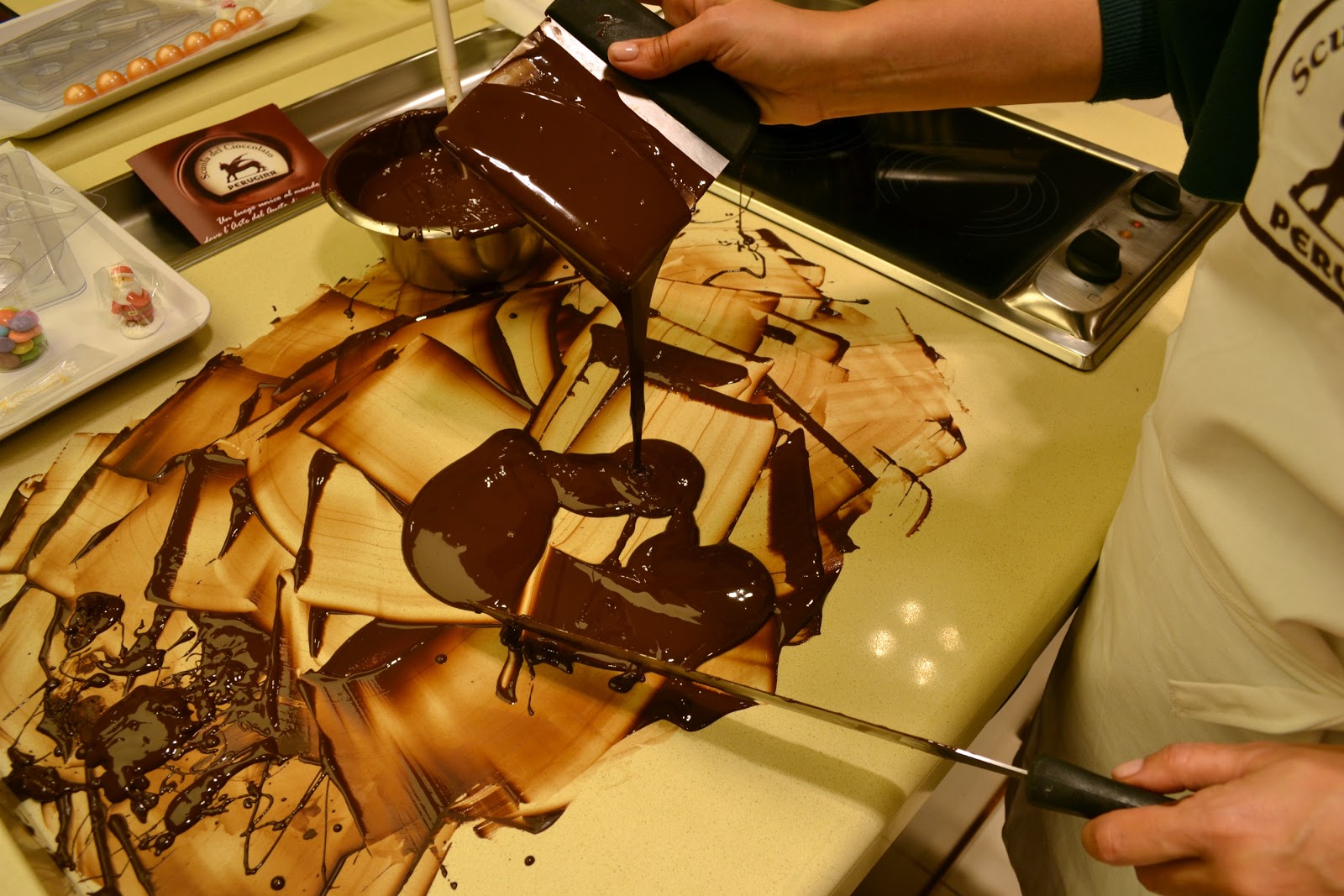 Tutto parte dallo stemperaggio del cioccolato, infatti dopo averlo sciolto, deve essere "lavorato" su un piano di marmo e acciaio fino a fargli raggiungere la temperatura di 31°.