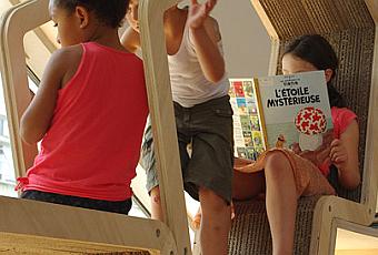 Quando si dice entrare nel mondo della lettura. Un gruppo di designer francesi, coordinato da Malo Mangin, ha creato una libreria veramente a misura di bambino. Non nel senso che gli albi illustrati sono tutti a portata di mano per lettori sotto il metro, ma l’hanno immaginata come un albero su cui arrampicarsi per andare a scegliere i frutti più buoni. Si tratta di una sorta di sentiero di montagna da scalare dove scovare tesori preziosi che, una volta trovati, si possono leggere comodamente acciambellati in alcune anse pensate apposta.