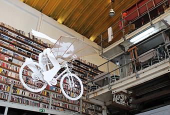Il centro della libreria è una grande macchina tipografica che oramai non è più attiva, ma che rende questo negozio unico nel suo genere. Questa è diventata anche il laboratorio di Pietro Proserpio, un inventore di origini italiane che realizza piccole creazioni meccaniche con materiali di scarto o oggetti quotidiani. Una macchina del tempo, qualche animale da compagnia, una bicicletta che pende dal soffitto e saluta i visitatori non appena varcano la soglia e un uomo che cerca di raggiungere la luna in sella ad un monociclo e con un ombrello tra le mani. Sì, si muovono davvero e sono incredibili.