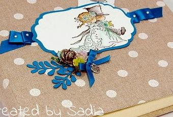 It looks like an album, but it is a book, in fact it doesn't have the tissue paper beteewn the pages, and the pages are made out of card-stock, to write or even apply some pictures... The stamp is lili of the valley, and it is colored with distress. The cover is made out of linen...