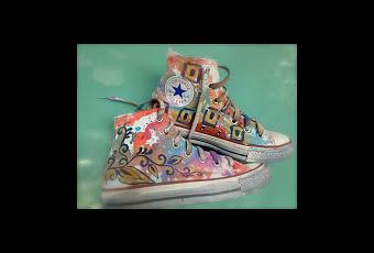 Le scarpe sono pezzi unici completamente dipinte a mano, le T-shirt sono realizzate con stampe dei miei dipinti sulle sui quali sono nuovamente intervenuta con la pittura a mano.