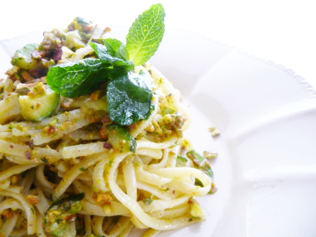Tagliare le zucchine a dadini e saltarle in padella a fuoco vivo con olio e uno spicchio d'aglio.Preparare il pesto frullando al cutter i pistacchi con tutti gli altri ingredienti, aggiungendo poca acqua per ottenere un pesto fluido.
