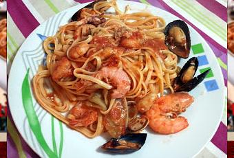 Ingredienti per 4 persone:- Linguine 400gr;- Polpa di pomodoro 200gr;- cozze e vongole con guscio e senza, gamberi, gamberetti, polipetti, capesante, mazzancolle 600gr in tutto;- olio extra vergine di oliva 4 cucchiai;- vino bianco un bicchiere;- aglio uno spicchio;- pepe q.b;- sale q.b.;- prezzemolo.