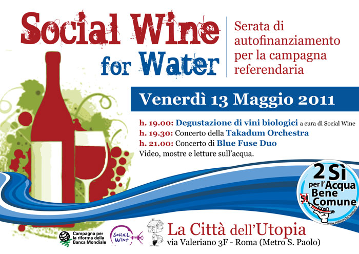 Gli amici del Social Wine ci segnalano per venerdì 13 di maggio una immancabile iniziativa a sostegno delle attività del Comitato promotore del referendum sull'acqua pubblica (http://www.acquabenecomune.org/). A partire dalle 19 ci sarà una degustazione di vini da agricoltura biologica e biodinamica e due concerti alternati con video e letture sull'acqua. La sottoscrizione per la degustazione è di 10 Euro e sarà in funzione la biosteria. Il programma lo troverete quihttp://3.bp.blogspot.com/-BLPVfxDWlrw/TcEocWzUNVI/AAAAAAAAJt4/NP3SpnlHMLE/s1600/socialWINE13-maggioWEB.jpgIl tutto presso la città dell'Utopia in Via Valeriano 3f (http://www.lacittadellutopia.it/).http://www.socialwine.it/2011/05/social-winele-cose-giuste-da-fare.htmlAccorrete accorrete gente ed aiutateci, please, a diffondere la notizia!