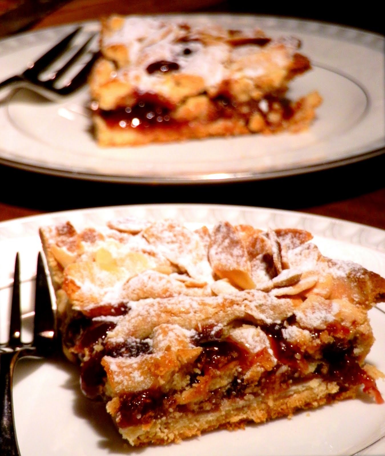 Ingredienti per una torta di 15 cm : 120 gr. farina 00 - 60 gr. farina di nocciole tostate e ridotte a farina – 60 gr. zucchero semolato – 1/6 cucchiaino di chiodi di garofano pestati – 1/3 cucchiaino di cannella in polvere – succo e scorza di 1/6 limone – zucchero a velo per decorare – ½ uovo magnum – 100 gr. burro morbido - salePer la farcia e la copertura : 140 gr. confettura di ribes o lamponi – ½ uovo – ½ cucchiaio di panna fresca – 20 gr. mandorle a lamelle - zucchero a velo per spolverizzare – ostie