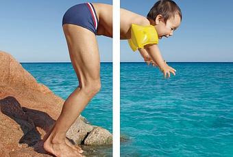 Evian nei suoi spot da sempre ce lo ricorda e per la sua nuova campagna, seguita da BETC Parigi, ha chiesto al fotografo Jean-Yves Lemoigne di realizzare immagini per il suo progetto Live Young. Due scatti dal paesaggio identico ma dal soggetto diverso, una variante del centauro, mezzo adulto e mezzo bambino.