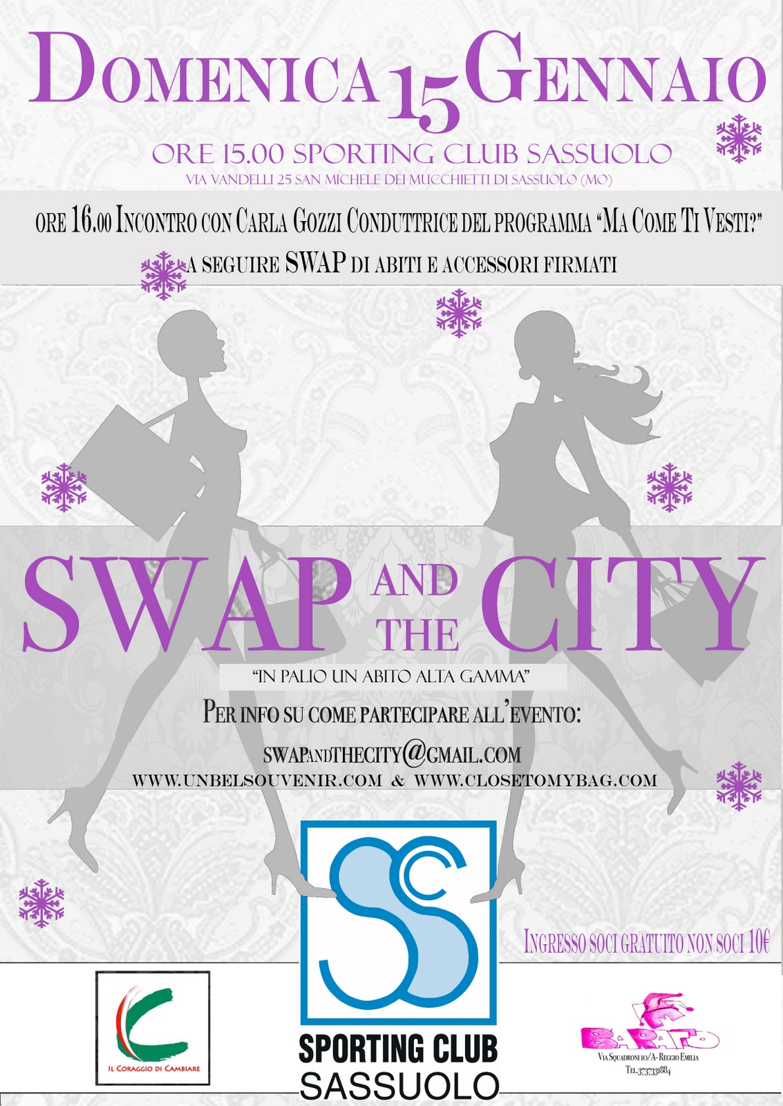 Carla Gozzi, inoltre, terrà una presentazione delle nuove tendenze per la primavera-estate 2012, sui capi da non perdere nello Swap e sui capi che non possono assolutamente mancare nel proprio armadio seguito dai suoi mitici consigli!L'ingresso ha un costo di 10,00 € comprensivo di iscrizione allo Swap e incontro con Carla. La partecipazione all'evento è a numero chiuso per cui si consiglia di prenotare l'iscrizione inviando una mail a [email protected].