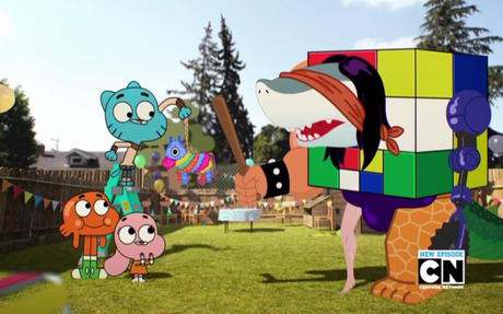 Anais organizza una mega festa nel cortile di casa...ma non viene nessuno, perchè la piccola non ha nessun amico ed è un disastro nei rapporti sociali. Così Anais, Gumball e Darwin immaginano uno strano essere con la faccia da squalo, una gamba da bambola, una da Cosa, con il corpo da cubo di Rubik e con un braccio forzuto e un braccio meccanico...ma sono sicuri che quello sia frutto della loro immaginazione oppure? Bella la gag iniziale dove Gumball e Darwin arrivano alla festa e salutano gli invitati invisibili e bella anche la gag del braccio forzuto che prima si nasconde tra le gambe dello strano essere, e poi va tra le braccia di Anais. Carina anche la gag delle labbra sorridenti e quella del "contatto visivo". Tuttavia, l'episodio ha anche una trama un po' stereotipata, a cominciare dal fatto che Anais, essendo una secchiona è socialmente goffa, come Lisa Simpson, per poi continuare con la storia del pericoloso evaso, ovvero il mostro amico di Anais. Divertenti le gag in cui i vari membri della polizia di intrufolano in casa Watterson e vengono distrutti in vari modi (la salsiccia viene fatta a pezzetti e la lattina viene schiacciata). Si scoprirà che il mostro in realtà era la creazione di un giocattolaio (suppongo un po' pazzo), e questa è una svolta narrativa poco sorprendente e piuttosto vecchiotta. Alla fine il mostro verrà abbattuto ed esploderà...ma alla fine, i vari pezzi che lo compongono si riassembleranno da soli e il mostro andrà a salutare Anais, promettendole di venirla a trovare prima o poi...mah. Questo episodio mi ha convinto solo per le gag e per i primi momenti iniziali, la trama l'ho trovata piuttosto sadica, mi dispiace che Anais non abbia amici, sarà forse perchè anche se va alle medie, ha pur sempre quattro anni e le ragazzine la snobbano o sono invidiose del suo "essere avanti"? Questa sarebbe una buona idea che vorrei fosse ufficiale nella serie, anche perchè Anais di rado si vede in giro nella scuola media e sarebbe divertente vedere la sua classe e i personaggi con cui si relaziona...peccato che gli autori non sviluppino questo lato della sua personalità, sono sicura che magari partendo da un clichè, potrebbero farne qualcosa di più complesso, in maniera leggera, ma gustosa e divertente. Mi dispiace, ma questo episodio, troppo banale e stereotipato, si merita un voto basso. Voto: 5 e mezzo/10E per oggi è tutto,al prossimo post!-Petralia Alaskana-