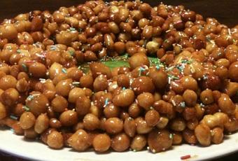 Lo strùffolo prima di nascere fa puzzare / di frittura la cucina sprovvista di camino / per l’olio che frigge la sottile buccia d’arancia / che smorza il sapore di molitura dell’olio / quando lo si mangia tagliato dal tòrtano / – tutti insieme seduti alla tavolata di Natale -, / accompagnato ad un bicchiere di moscato / di uva pregiata di vigneto patronale / ricompensa, quale disobbligo, / per una favorevole intermediazione; / ma se si tenesse conto del lavoro toccato ( alla moglie per fare quel prelibato boccone / – che per un pomeriggio intero, sino a sera, ha dovuto impastare, spianare la pasta / sul tavoliere e poi ridurla in sottili bastoncini, / tagliarli in mille piccoli pezzettini / sulla spianatoia e, infine, friggerli -, / a lei alzerebbe il bicchiere per brindare, / con cuore innamorato, per la sua costanza / nel tenere salda quella tradizione / che tramandata, insieme a tutte le altre, / lenisce le asprezze della quotidianità. / Intanto si mangia frittura profumata / che, tutto sommato, ha un costo contenuto / considerando gli ingredienti acquistati: / farina, olio, alcool, ammoniaca, / il consumo del gas per il tempo della frittura, / sono spese che può concedersi ogni tasca / anche se si aggiunge quella dell’eventuale / aiuto di una donna che col suo ciarlare / non fa notare il tempo che passa. / Nella serata, poi, la moglie, tutta sola, / provvede a sistemare gli strùffoli / disponendoli a tortano o ciambella / e a spargervi sopra anisini tolti dalla busta, / cannella in polvere con moderazione, / e miele in quantità senza risparmi / e, come ulteriore decoro, i gustosi pinoli; / ammirato per l’allegria dei colori e dall’odore / ti soffermi a guardare e pensare sia una corona / d’alloro per lei e, ti dici: “che duri !”.
