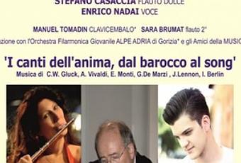 Venerdi 4 Dicembre alle 20.30 presso la chiesa luterana_Largo Panfili di Trieste si terrà il concerto "I canti dell'anima, dal barocco al song". L'evento è organizzato dall'associazione APS "NOVA ACADEMIA ALPE ADRIA" in collaborazione con gli amici della musica di Udine e il ministero dei beni e attività culturali e del turismo. Interpreti della serata saranno l'orchestra d'archi "La sinfonietta"diretta dal maestro Ezio Monti e solisti di chiara fama come i flautisti Stefano Casaccia e Luisa Sello e il cantante Enrico Nadai, conosciuto al grande pubblico per le sue partecipazioni alle trasmissioni televisive "Io canto" e "XFactor". Saranno eseguite musiche di Vivaldi, Bach,Monti, J.Lennon, I. Berlin, De Marzi.