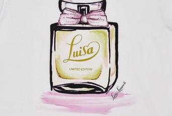Si tratta di una simpatica maglia bianca a girocollo, con manica corta e con una stampa stilizzata del profumo Luisa, la prima fragranza messa in commercio dal marchio.