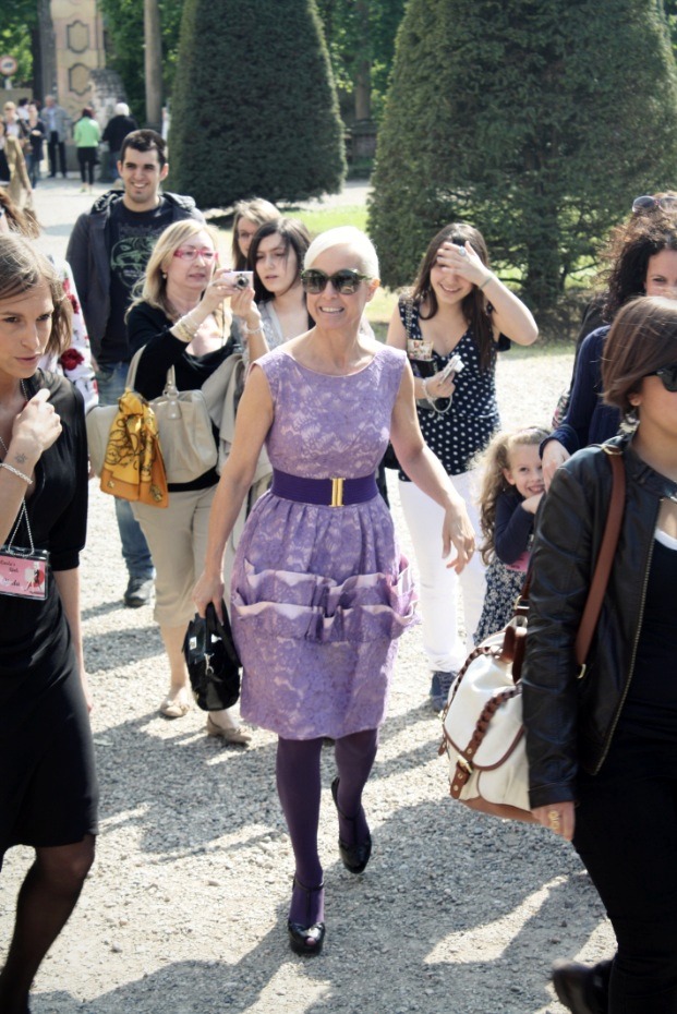 Indossava un carinissimo vestito viola, la cintura però non mi piaceva così tanto, capelli biondissimi, pochette e scarpe taccatissime piuttosto semplici.