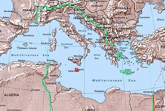 Mappa del Mare Nostrum Italiano nel 1942: in verde i territori controllati dalla marina italiana, in rosso i territori controllati dagli alleati nell’estate del 1942.