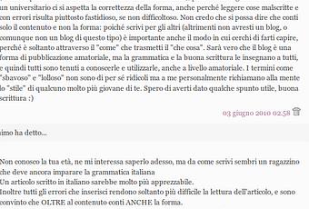 A meno che non ci sia qualcuno disposto a farmi da "bozzista"(termine da me appena coniato), o da revisore di articoli prima della loro pubblicazione (si potrebbe fare una cosa usando wave) ma la mole di articoli sarebbe alta e io di solito non rispetto ne i week end ne i normali orari da studenti della scuola dell'obbligo, quindi la cosa mi sembra un po utopica.