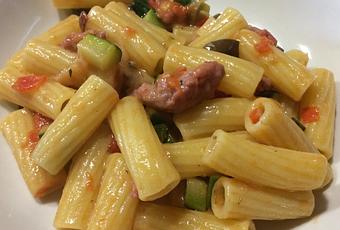 MACCHERONI CON SALSICCIA ZUCCHINE OLIVE E POMODORINI