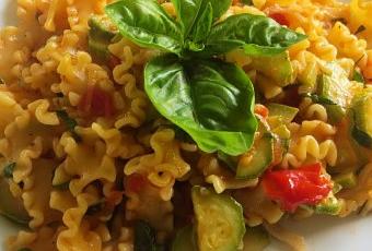 Un piatto di pasta tipicamente mediterraneo con zucchine, pomodoro e basilico, reso intrigante dal guanciale, che dona una sfumatura di carattere agli ingredienti vegetali.