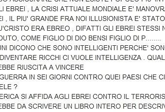 Oggi mi sono visto arrivare un commento inquietante al mio post del 26 dicembre 2011 “Giorgio Bocca: “Cretinate, avevo solo ventidue anni…” [1]… ho deciso di pubblicarlo come immagine, ma di non rivelare l’indirizzo email, che sarebbe stato evidente qualora avessi approvato il commento. Il sottoscritto prende le distanze e non si assume la responsabilità di quello che è stato scritto da questo sedicente “Mago Silva”. Tra parentesi trovo che il contenuto del commento sia in linea con il falso storico dei Protocolli dei Savi di Sion. C’è ancora chi crede che tutto avvenga grazie ad una manovra ebraica mondiale… Io credo che questa crisi economica sia pilotata e che rappresenti un modo diverso di rimescolare le carte senza ricorrere alla guerra, come era avvenuto per ben due volte nel Novecento, ma temo che ancora una volta si cerchi di far ricadere le colpe su una presunta congiura “sionista” per nascondere i reali responsabili.