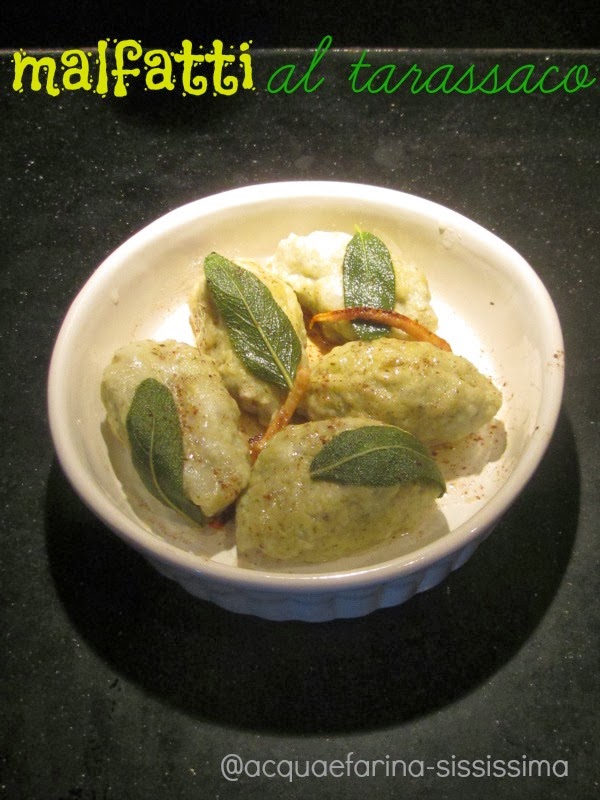 ingredienti per 2 persone: mezzo vasetto di salsa di tarassaco bio CIBI REALI 250 gr ricotta 1 uovo 50 gr parmigiano grattugiato 70 gr farina 20 gr burro salvia mezzo limone non trattato (della mia pianta!!) cannella sape pepe Ho lavorato la ricotta con l'uovo, il parmigiano grattugiato, la salda di tarassaco, e 30 grammi di farina, sale e pepe, ho formato i malfatti con l'aiuto di 2 cucchiai e li ho rotolati nella farina. In una padella ho sciolto il burro con la scorza di limone tagliata a striscioline, qualche foglia di salvia, cannella, non appena il burro inizia a prendere colore spegnere e togliere dal fuoco. Ho cotto i malfatti in acqua bollente salata in leggera ebollizione: quando vengono a galla scolarli delicatamente e sistemarli nei piatti, aggiungere sopra il burro aromatico, se volete potete aggiungere ancora un pò di pepe.