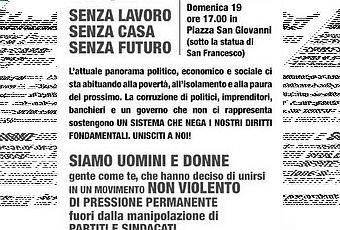 3)Forma: PRESIDIO STATICO di INDIGNAZIONE.Nessun corteo, ognuno/a scenda in piazza con cartelloni, pentole, tamburi, musica slogan, e quanto più gli venga in mente per manifestare LA PROPRIA INDIGNAZIONE. Ma sopratutto, ognuno porti la PROPRIA PERSONA! IMPORTANTE: nessuna bandiera di nessun partito. Se vedete una bandiera chiedete a chi la porta di abbassarla.Chi vuole può vestirsi di bianco (colore neutro), ma qui non è importante la forma, sono importanti i contenuti.