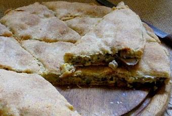 Prendere l’impasto, dividerlo in due (un pezzo leggermente più grande dell’altro e tirarlo con il mattarello nelle dimensioni della teglia dove si andrà a cuocere la pita. Lo strato sotto deve essere leggermente più grande per poter ripiegare i bordi sul ripieno. Oliare la teglia e stender la pasta. Versare sopra il ripieno e distribuirlo uniformemente. Sbattere un uovo e versarlo sul ripieno. Stendere il secondo pezzo della pasta, coprire il ripieno, oliare con un pennello e con un coltello affilato incidere la pita senza andare fino il fondo. Questo lo facciamo per dar modo ai vapori del ripieno di fuoriuscire e non far diventare molliccia la pasta.