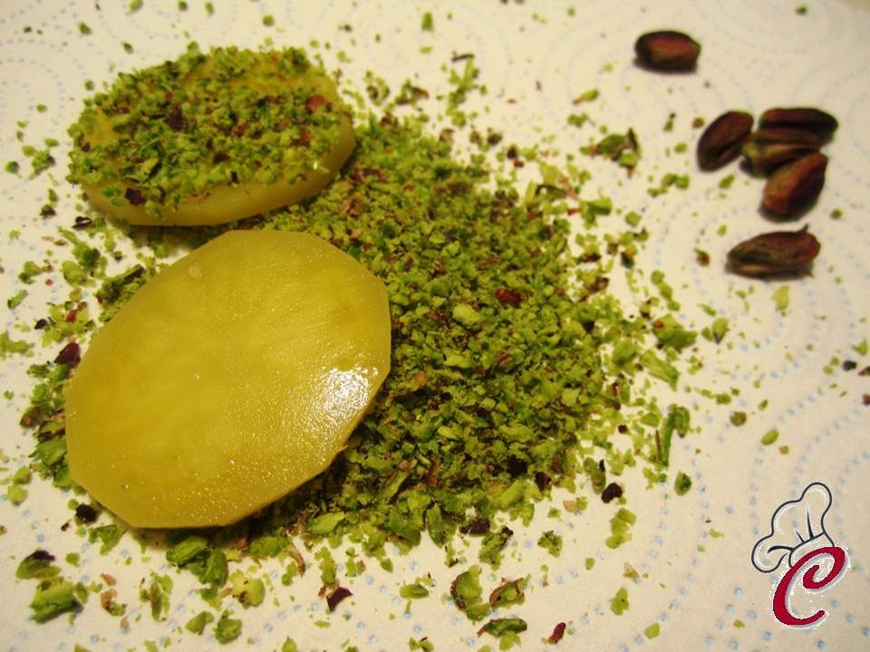 Cuocetele a vapore per pochi minuti, in modo che si ammorbidiscano appena. Nel frattempo tritate i pistacchi piuttosto finemente e rovesciateli su un foglio di carta assorbente. Passate ciascuna fettina di patata sul trito, premendo leggermente, prima da un lato, poi dall'altro. Tenetele da parte.