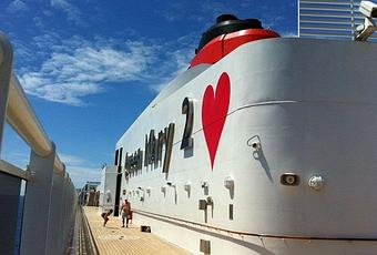 Da una parte del fumaiolo, un grande cuore dipinto accanto al nome della Nave e dall'altra parte, una proposta di matrimonio per una coppia (Stefan e Jess) che non era sulla nave, il tutto combinato con una trasmissione televisiva locale.