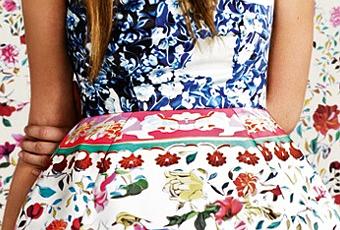 Mini dress, top, camicette, leggings, sciarpe, abiti lunghi con fiori nei colori del blu, giallo mimosa, rosso corallo, arancio e le fantasie tipiche dei servizi di porcellana che fanno di questa designer la nuova stella del fashion system.