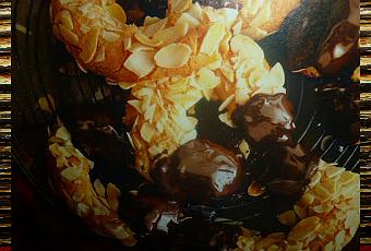 la pasta di marzapane è molto versatile in questa ricetta abbiamo preparato dei biscotti ricoperti di mandorle e inzuppati nella glassa di cioccolato semifondente vegan