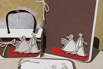 Realizzato da Nicoletta, partecipazione, portaconfetti e segnaposto tutto con timbro Aladine, cartoncini Toga, decoro rosso con fustelle Sizzix.