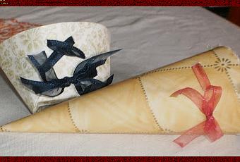 Uno è un semplice cono di carta da parati con i bordi consumati per dargli un effetto vintage e un nastrino di raso passante vicino al bordo.