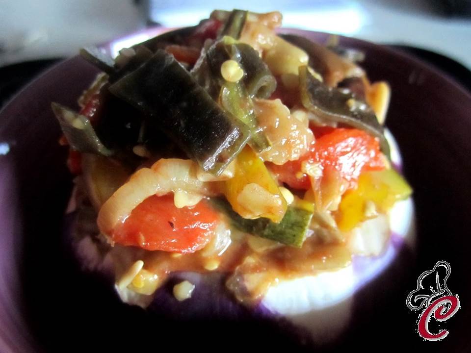 Lavate tutte le verdure, asciugatele e tagliatele a tocchetti. Tagliate anche la polpa della melanzana prelevata. Scaldate un filo di olio in una padella, quindi affettate sottilmente la cipolla e fatela imbiondire. Unite, in ordine, i peperoni, poi la zucchina, poi la polpa di melanzana e i pomodori.