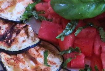 Oggi un contorno semplicissimo, apprezzabile da tutti coloro che apprezzano le melanzane. Qui sono tagliate a fette e grigliate, accompagnate da una allegra dadolata di pomodoro fresco e profumate da una bella julienne di basilico. Olio extravergine d’oliva, sale e pepe e niente altro. Potete prepararle anche come antipasto in abbinamento a vari crostini, formaggi e salumi.