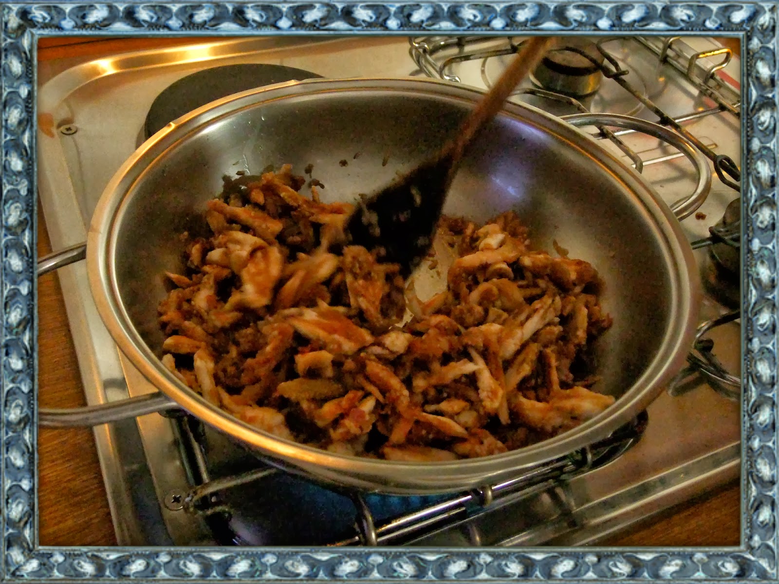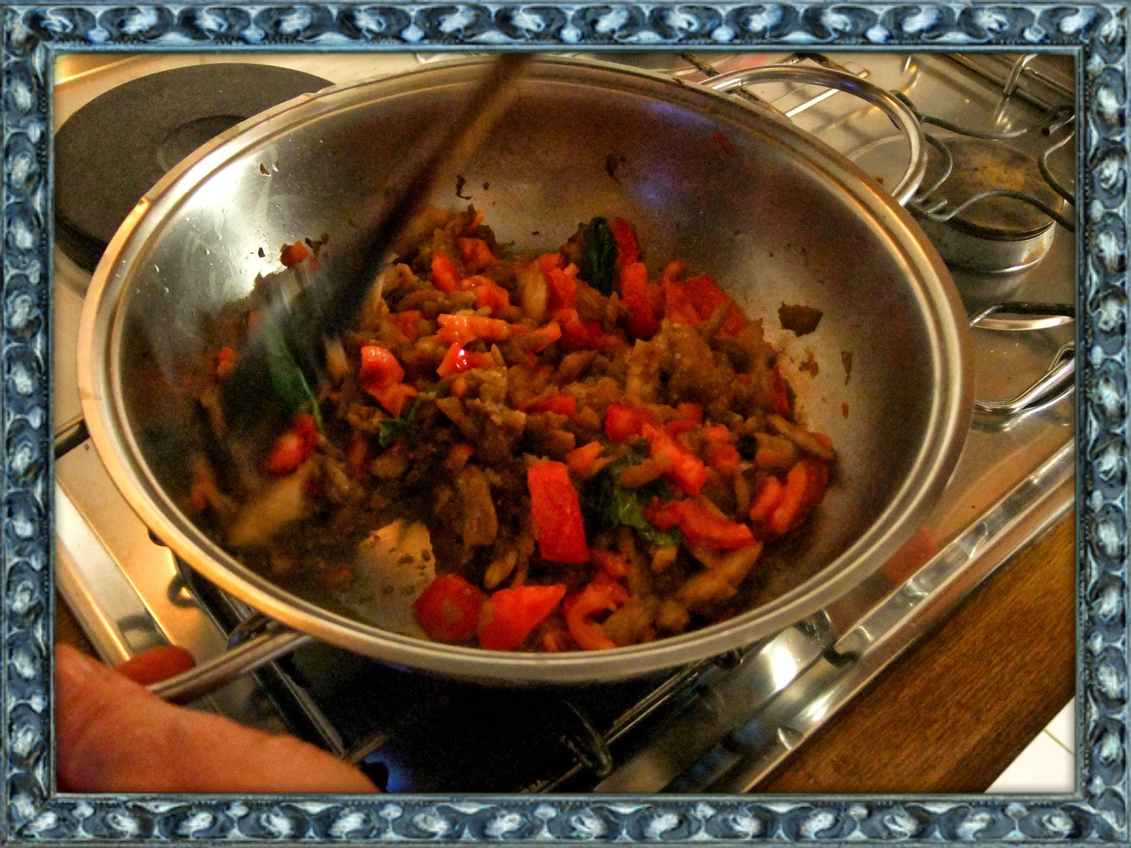 Si soffrigge la polpa delle melanzane spezzettata con olio e un cipollotto, fino a che non diventa morbida.
