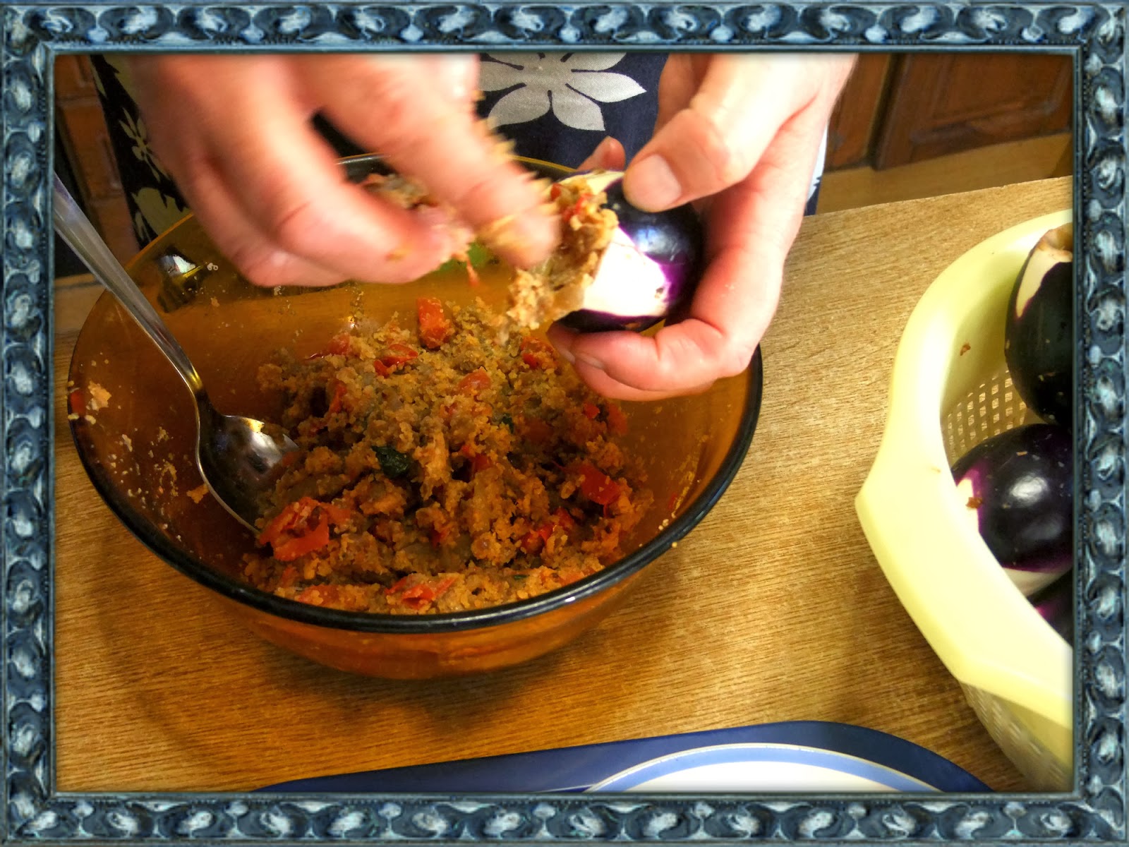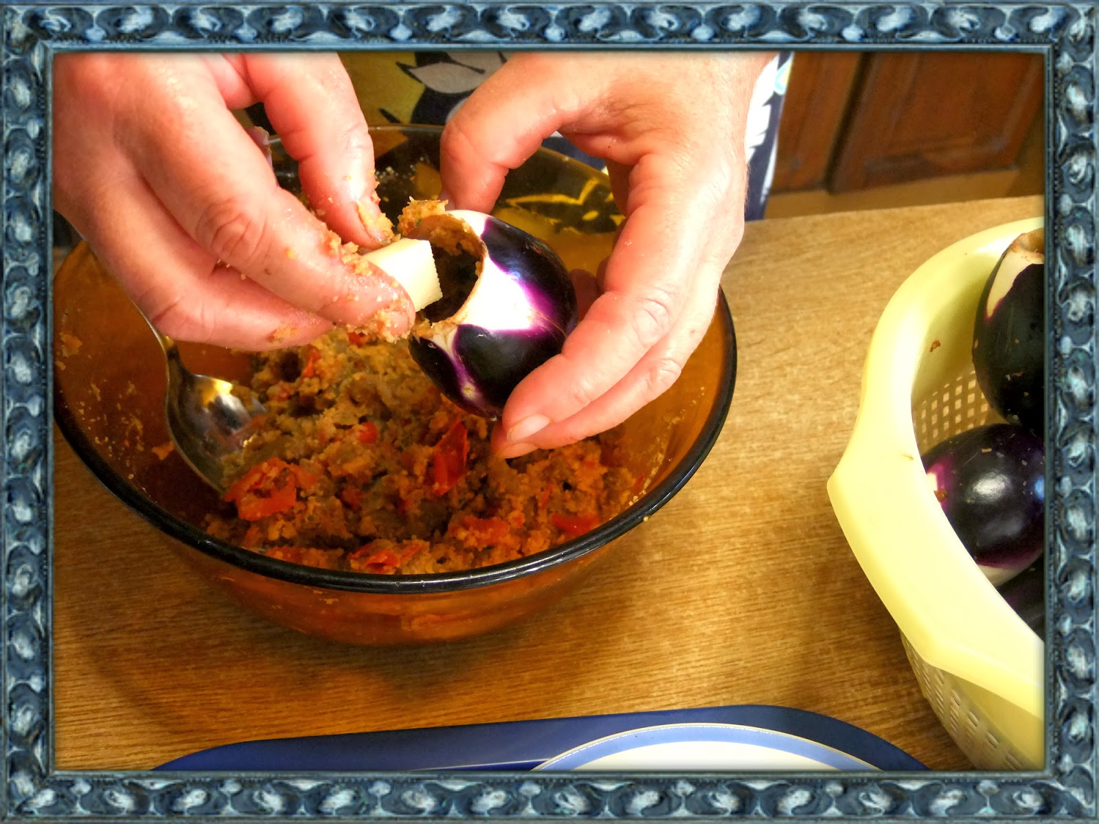 Richiudete il tutto con la parte superiore della melanzana , ripulita
