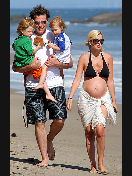 Sempre a Malibu Tori Spelling mostra la sua bella pancia seguita dal marito Dean McDermott con in braccio i figli Liam, 4, and Stella, 3.