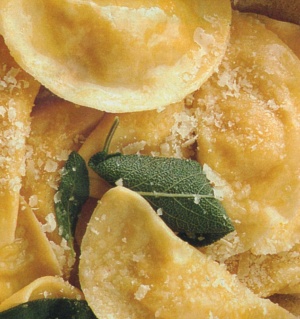 Mettete nel centro di ciascun disco un cucchiaino di ripieno e ripiegate la pasta a metà. Premete bene il bordo con la punta delle dita in modo da saldarla. Buttate i ravioli in abbondante acqua bollente salata e cuoceteli a fuoco basso in modo che non si aprano durante la cottura. Scolateli con una paletta forata, trasferiteli in una terrina, conditeli subito con il grana rimasto e con 80 gr di burro color nocciola in cui avrete soffritto le foglie di salvia. Servite subito caldissimo.