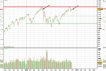 Mercati azionari: Sp500Eccoci sul mercato americano, che evidenzia un'ampia fase di lateralità.Pongo alla vs attenzione il precedente movimento che se fosse speculare....Poi ci rimane da capire se questa fase sia di accumulazione o di distribuzione.Il quesito non è semplice,perchè il Dax e in fase rialzista i Piigs in fase ribassista Sp 500 laterale.Un bel rebus a cui è difficile rispondere,quindi non ci resta che attendere delle rotture del trading range, per le posizioni di medio,mentre a vs discrezionalità per quello di breve,che sembra ribassista.