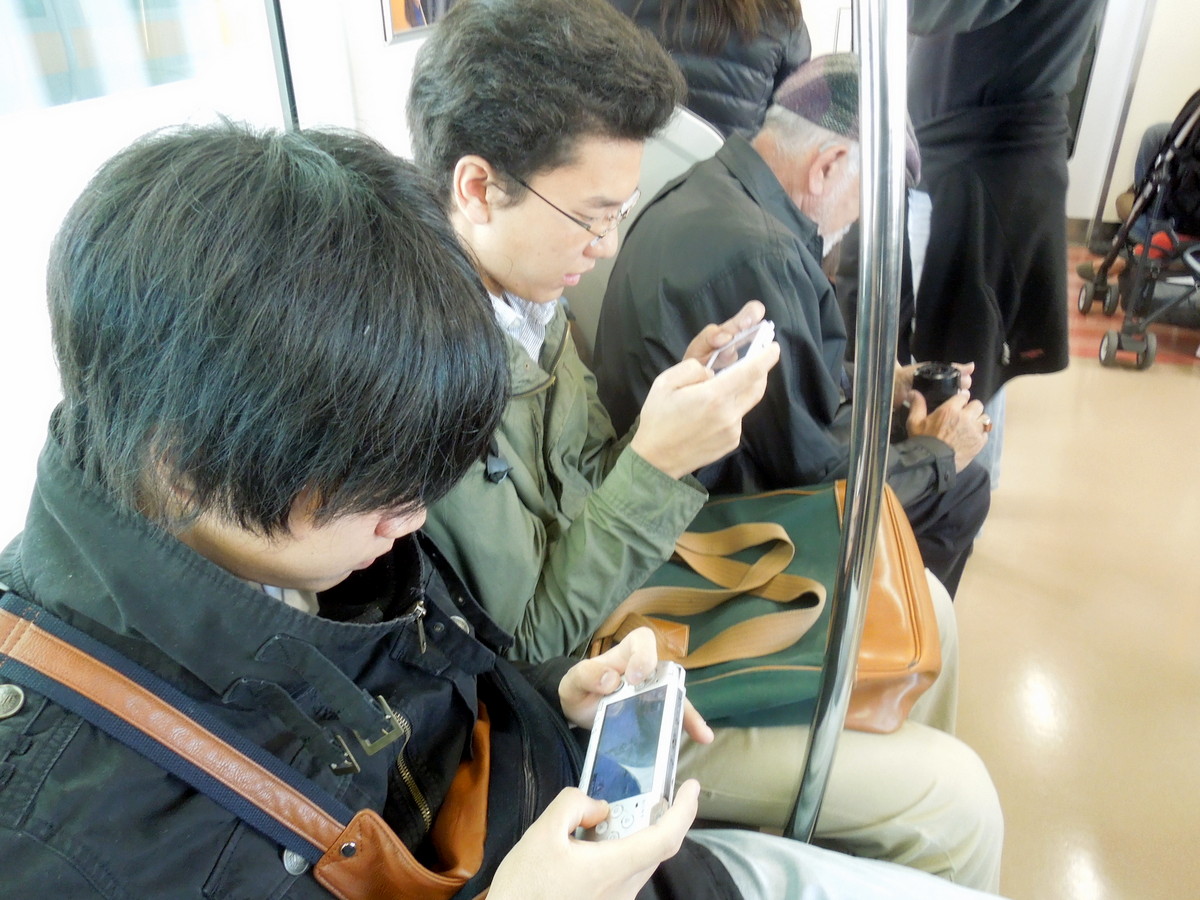 Ho trovato métro-boulot-dodo molto attuale anche ora a distanza di tanti anni. Queste foto sono state scattate sulla metropolitana di Tokyo, ma probabilmente, se non ci fossero gli occhi a mandorla, sarebbero le stesse di qualunque metropolitana di una grande metropoli, New York, Parigi, Londra, Mosca e tante altre. Se ne conoscono da sempre le ragioni, distanze immense, ore passate nei trasporti, ritmi lavorativi incalzanti e lo stress che attanaglia. Così risulterebbero possibili due sole alternative, smanettare sul telefonino o scivolare inesorabilmente fra le braccia di Morfeo.