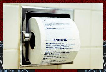 David Gillespie e altri programmatori hanno creato un fantastico sevizio di print on demand: vai sulla pagina di Shitter, fai il normale login con il tuo account di twitter e durante la navigazione non devi fare altro che selezionare i tweet più stimolanti e passare alla pagina Paypal: per soli 35 dollari, più 28 di spese di spedizione per l'Italia, riceverai a casa quattro rotoli di carta igienica stampata con i tuoi tweet preferiti o più odiati... E se ti stai dicendo che, giusto per stare in tema, questa ti pare proprio n'à strunzata sappi che in rete sta spopolando e pure senza costi pubblicitari. Dei geni sono.