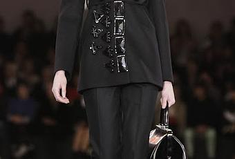 Cristallizzami di Prada. Così Miuccia rinnova la sua donna, due vie per creare ciò: i cristalli e le stampe geometriche allover.I capi scendono, cadono con un rigore maschile, fatto di panni di lana dalle rigide strutture, tagli decisi. Ma, sono sempre i dettagli a fare la differenza, una cintura sotto il seno, può rendere femminile anche il cappotto più maschile.Cristalli neri, bacchette, pietre dalle forme più strane si posano talora alla fine di pantaloni, nei revers delle giacche, negli orli, nelle borse.