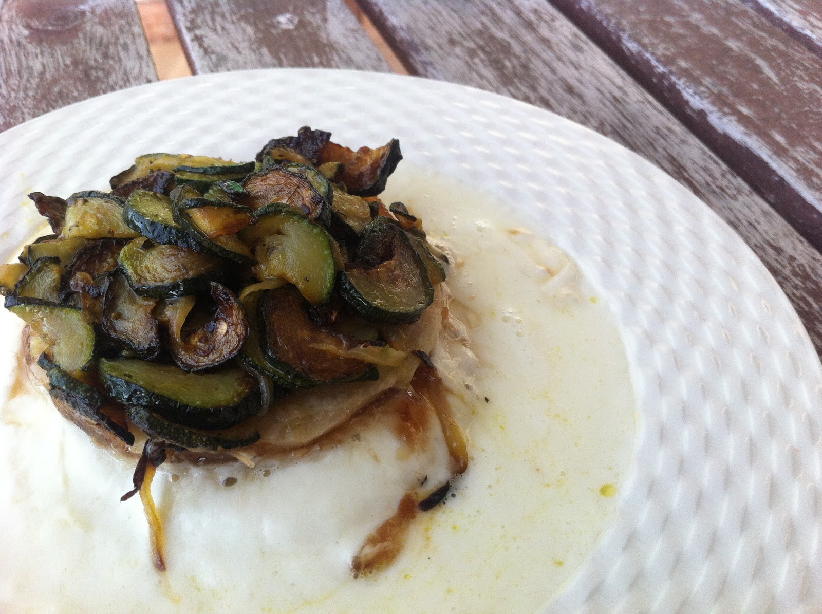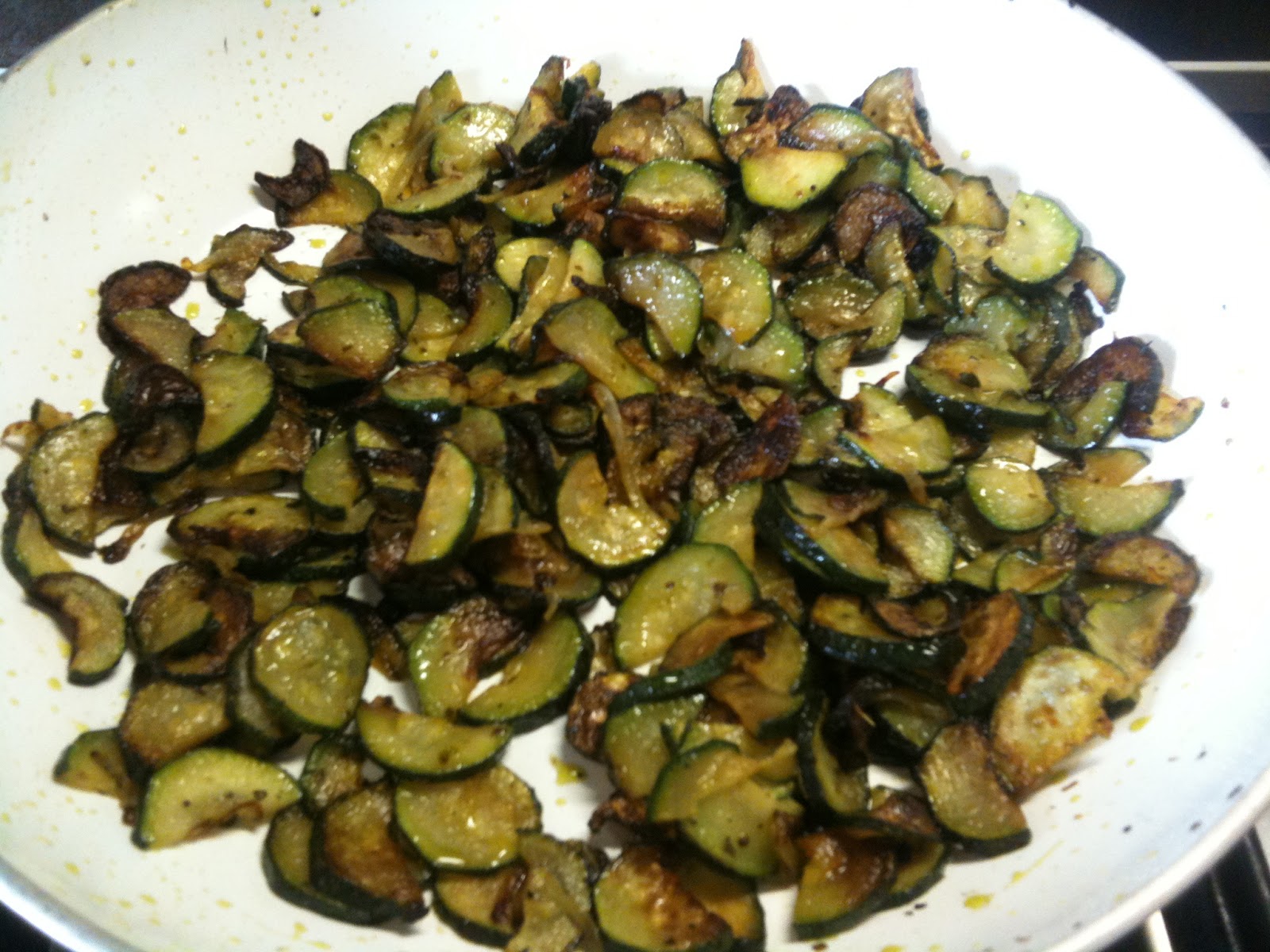 Ho lavato le zucchine, eliminato le due estremità e tagliate a rondelle piuttosto sottili. Ho messo a cuocere le zucchine insieme alla piccola cipolla precedentemente cubettata in una padella a fiamma vivace per qualche minuto. Aggiustato di sale e pepe.