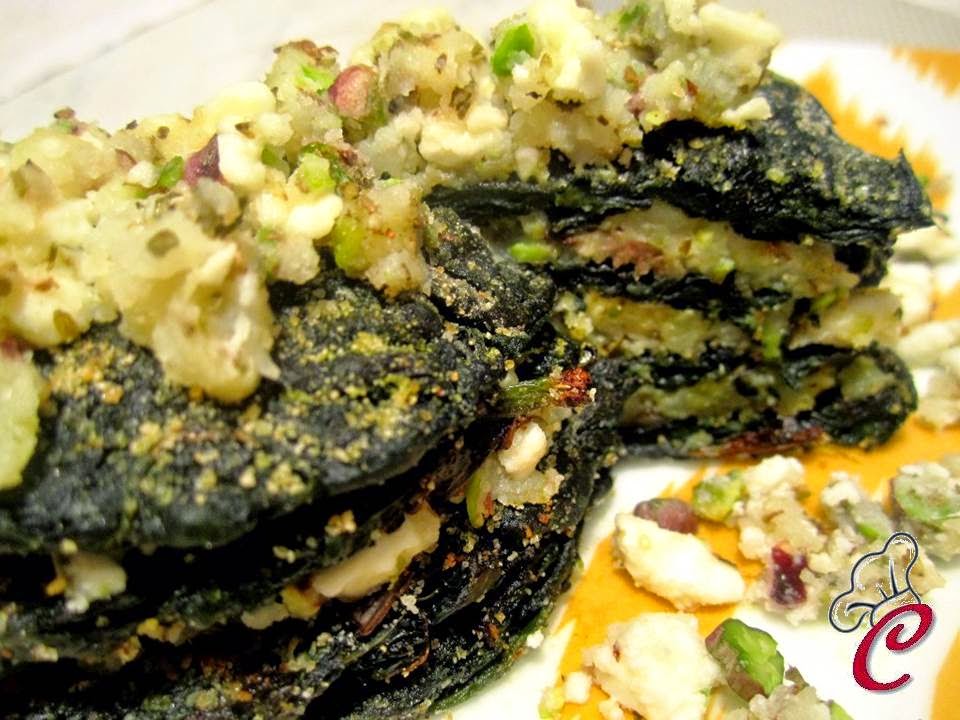 Lavate accuratamente le foglie degli spinaci. Cuocetele al vapore fino ad ammorbidirle appena, quindi strizzatele. Salatele a piacere e compattatele dormando delle cialde dello spessore di pochi millimetri. A questo punto io ho utilizzato l'essiccatore, ma se non lo aveste potrete utilizzare il forno. Servirà che facciate asciugare il più possibile i medaglioni appena formati.Nel frattempo fate bollire la patata fino a renderla morbida. Schiacciatela con una forchetta, unite i pistacchi tagliati a coltello e l'origano. Coreggete di sale e mescolate tutto. Lasciate raffreddare: in questo modo i sapori si armonizzeranno perfettamente.