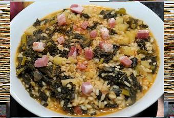 Minestra di riso e patate con cavolo nero e pancetta