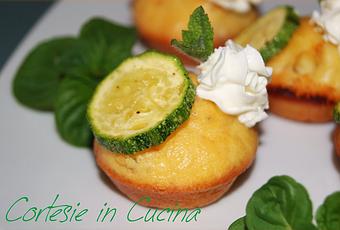 Togliete i vostri cupcakes dal forno, fateli raffreddare e guarnite con una fettina di zucchina e con la sac-a- poche un ciuffo di formaggio, decorate con piccole foglie di mente.
